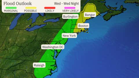 - The greatest chance of at least localized flooding exists from Long Island to eastern New England.